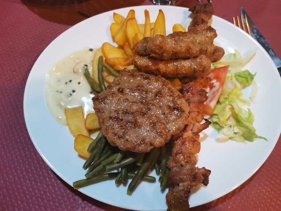 Nous sommes aller manger en soirée dans ce restaurant de spécialités Serbe. Une première pour moi et aucune déception, bien au contraire. Avant de m'y rendre j'ai bien sûr regardé sur Google les avis et photos. Et j'ai pu y voir plusieurs très bon avis, en revanche les photos n'était pas très vendeuse. Je peux vous assurer que les assiettes sont bien plus garnies et imposantes que sur les photos. Nous avons été très surpris de la quantité. Niveau qualité rien à dire, très bon ! 👌 4 menus dont 1 enfants. Entre 10 et 23€ par menu. On en a eu pour moins de 30€ par personne avec un menu à 21,50€ (entrée, plat, dessert) + apéro et verre de vin (d'origine Serbe). Équipe souriante et sympathique. 😁 Je recommande d'essayer pour ce faire son avis comme toujours. 👍 J'avais pris le plat avec assortiment de viandes. (voir photo)